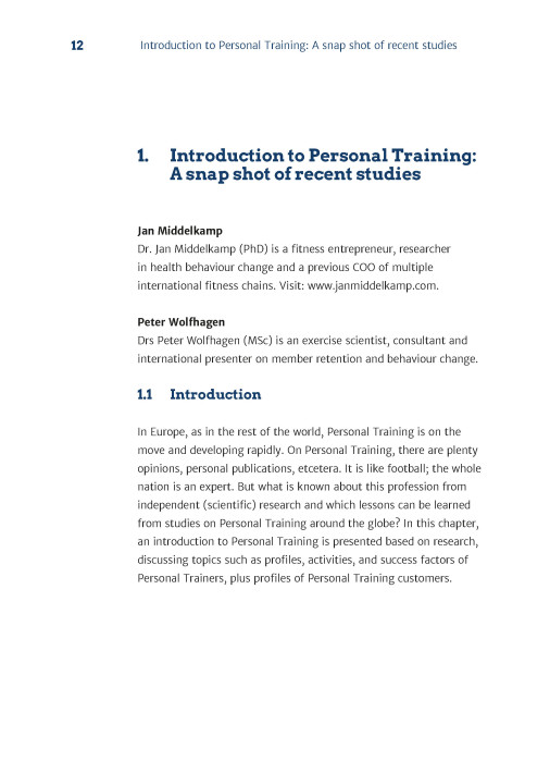 Most Personal Trainers rate that not only competition is a thread but also change in taxation and the offering in online fitness. Opportunities for Personal Trainers are elderly people and preventive healthcare.Also insights are given into the Personal Training customers; what type of customer can be identified and what do customers expect from Personal Trainers.This book is written for fitness professionals already being or planning to be active as Personal Trainers and club owners or managers